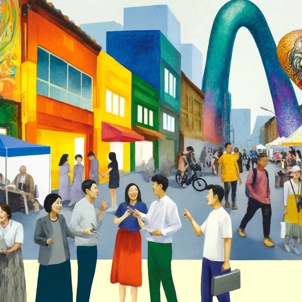 나는 지난 7월 14일부터 8월 13일까지 전주문화재단의 의뢰로 동아시아문화도시 프로그램의 일환으로 한중일 현대미술 교류전을 진행했다. 그 전시를 준비하던 중 5월 초 충북문화재단의 의뢰로 대성로 122번길 예술로 행사도 기획을 하게 되었는데 전주 전시를 준비 하던 중 알게된 일본 교토를 베이스로 활동하고 있는 오쿠나카 아키히토 작가의 작품을 중심으로 대성로를 예술의 거리로 만들 계획을 세웠다. 그리고 지난 9월 2일과 3일 양일 간 대성로122번길 일대에서 행사를 진행했다. 오쿠나카 아키히토 작가는 다이크로익(무지개빛) 필름과 비닐을 이용한 대형 잍플래터블 inflatable (공기주입식) 조형물을 만드는 작가로 일본의 시즈오카에서 미술교육을 전공한 후 어린이 미술 워크숍 등 어린이 프로그램에 최적화된 작가였기에 대성로122번길 프로젝트에 적합한 작가라 생각해 청주로 초청을 하게 되었다.